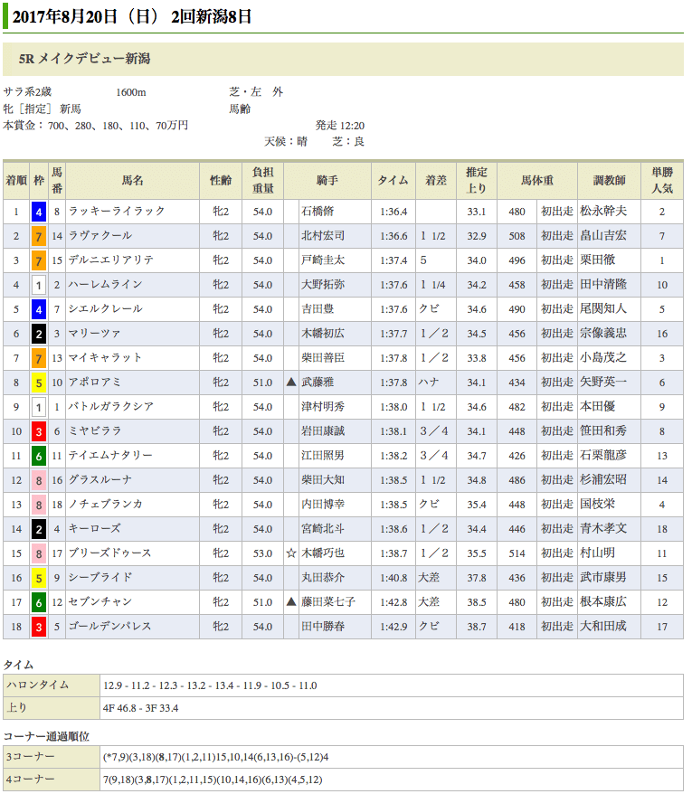 またその直後に行われた新潟5R 2歳新馬戦 芝1600m に出走したラッキーライラックも、先行集団の中から直線、楽な手応えで突き抜け、デビュー戦を快勝。