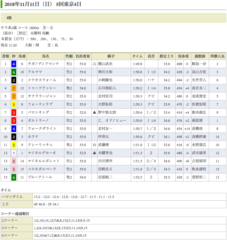 本日2018年11月11日の東京4R 2歳未勝利 芝1800m に出走したタガノディアマンテが、先団後方よりの位置取りから、直線で内を突き、そこから外へ外へと寄れながらも抜け出し優勝しました。