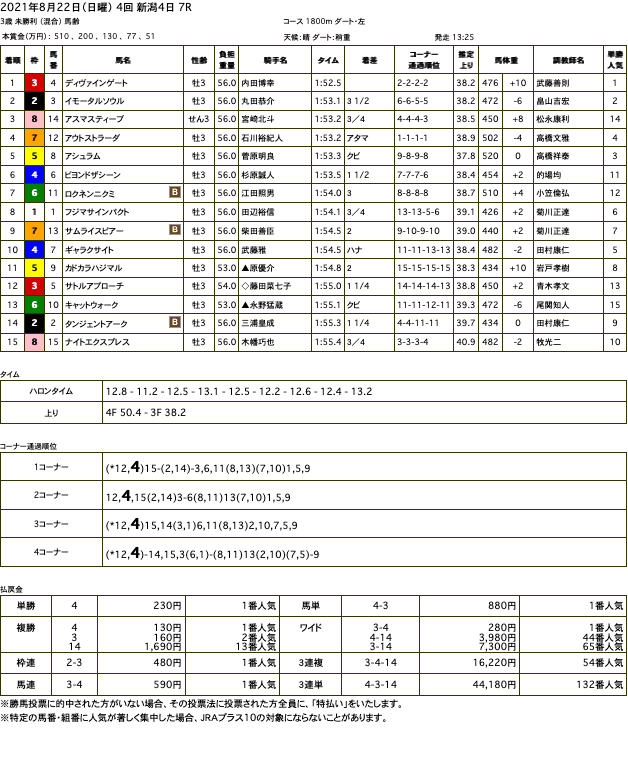 本日2021年8月22日の新潟7R 3歳未勝利 ダート1800m に出走したディヴァインゲートが、スタートから出鞭をくれて前へと取り付くと、道中2番手の外から直線で悠々と抜け出し優勝しました。