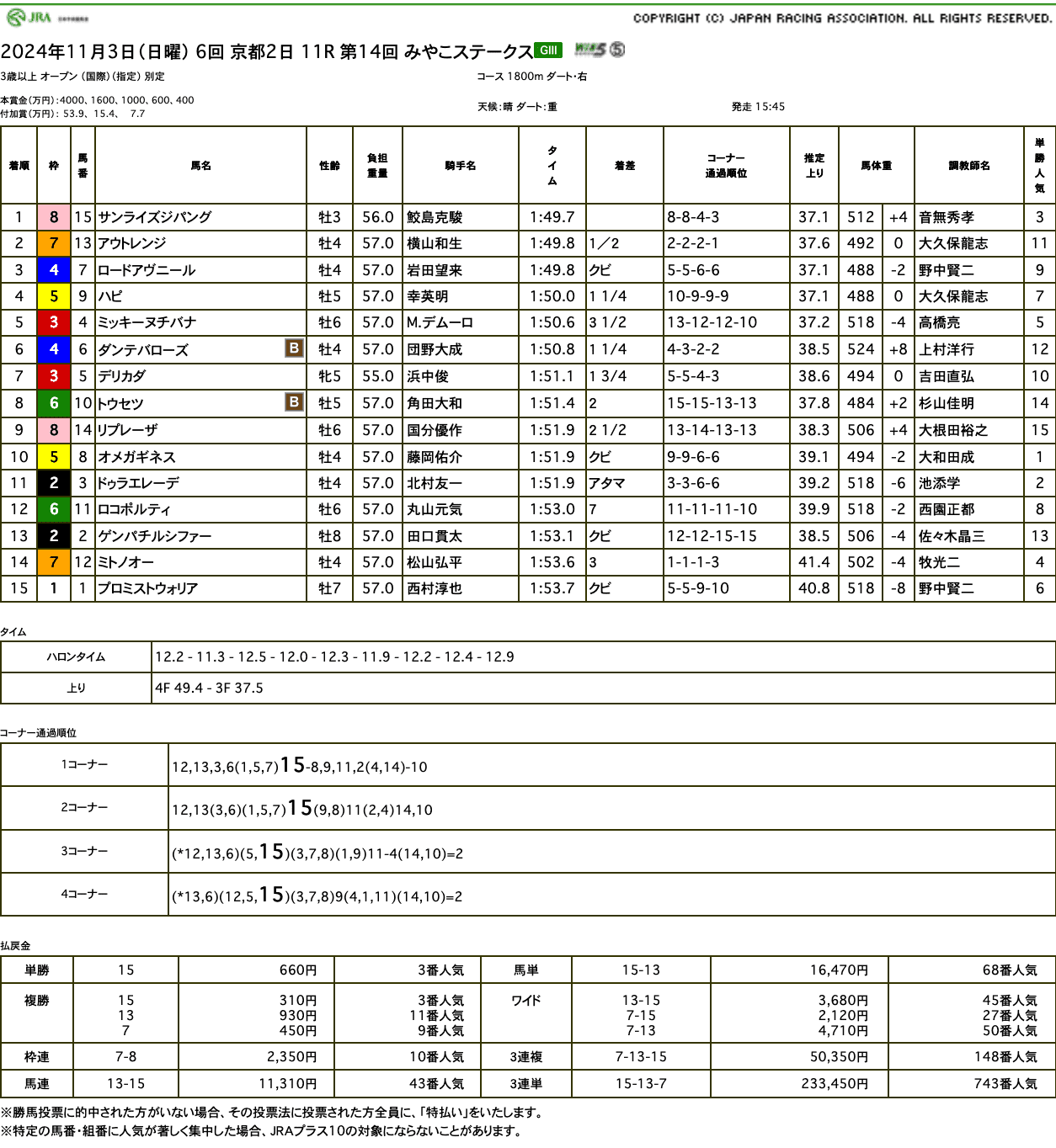 本日2024年11月3日に京都競馬場で行われた第14回みやこステークス(GIII)ダート1800m に、オルフェーヴル孫のドゥラエレーデが出走。