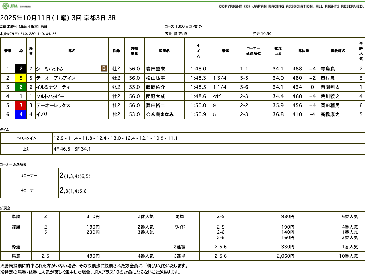 本日2025年10月11日の京都3R 2歳未勝利 芝1800m に出走したシーミハットクが、スタート直後は控える構えも、やや引っかかり出すや内からハナを奪いきりレースを引っ張ると、迎えた直線も他馬を寄せ付けずに押し切って優勝しました。